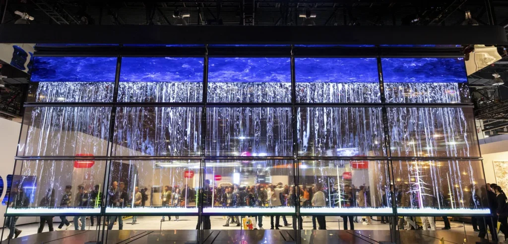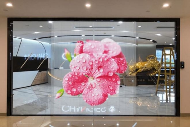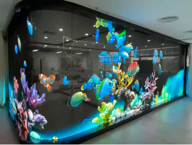 Large-format transparent screens made of LED strips mounted on a clear substrate. They are used for window displays, showrooms, and stage backgrounds.
